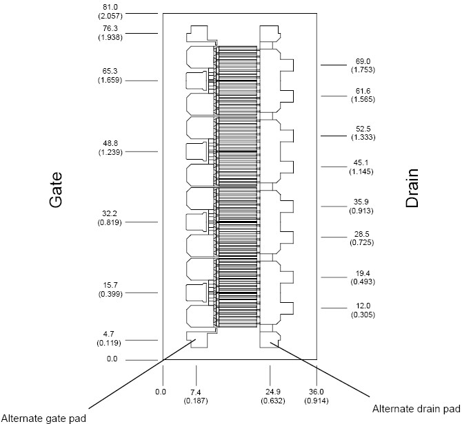 - Die size: 36.0 x 81.0 x 4.0 mils (0.914 x 2.057 x 0.102 mm)
