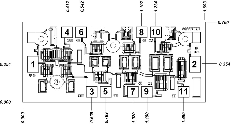 The TriQuint TGP1439 is a 5-bit digital phase shifter MMIC using TriQuint?'s proven 0.5 OhmpPower pHEMT process to support a variety of K band phased array applications including satellite communication systems. The 5-bit design utilizes a compact topology that achieves a 1.27 mm² die area, high performance and good tolerance to control voltage variation. The part provides a 5-bit digital phase shift function with a nominal -5 dB insertion loss and 3° RMS phase shift error over a bandwidth of 18 to 20 GHz. This device requires a minimum of off-chip components and operates with a -5.0 V to -2.5 V control voltage range. Each device is RF tested on-wafer to ensure performance compliance. The device is available in chip form.
