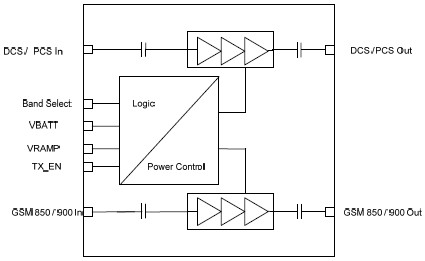 The TriQuint TQM7M4007 is an extremely small (5 x 5 x 1 mm) multi-mode power amplifier module for GSM / GPRS applications. This module has been optimized for high GSM / GPRS efficiency. The module incorporates two highly integrated InGaP power amplifier die with a CMOS controller. The CMOS controller implements a fully integrated closed-loop power control within the module for GSM operation. This eliminates the need for any external couplers, power detectors, current sensing or other components to assure the output power level. The latter is set directly from the Vramp input from the DAC. The module has Tx enable and band select. The module construction is a low-profile over-molded land-grid array on a halogen free laminate.