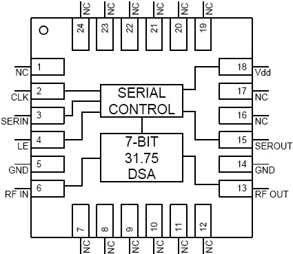The TriQuint TQP4M9083 is a high linearity, low insertion loss, 7-bit, 31.75 dB Digital Step Attenuator (DSA) operating over the 0.4 to 3.5 GHz frequency range. The digital step attenuator uses a single positive 5 V supply and has a serial periphery interface (SPIâ„¢) for changing attenuation states. This product maintains high attenuation accuracy over frequency and temperature. No external matching components are needed for the DSA. The TQP4M9083 is available in a standard lead-free / green / RoHS-compliant 24-pin 4x4mm QFN package. The TQP4M9071 and TQP4M9072 are also available from TriQuint as a footprint and pin compatible 6-bit, 31.5 dB DSA with a parallel control interface and serial control interface respectively.