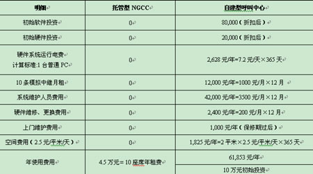 托管型NGCC最大的优势有两个,一是成本优势,二是灵活性高。相比自建型呼叫中心,托管型NGCC成本优势显而易见,请参阅下面的成本对比表: