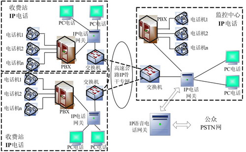 高速公路采用VoIP技术,系统具体实现结构如图3所示。实现方式可以实现收费车道对讲及对外通信、部门间的业务电话的通信和IP电话网与外部公众电话通信。