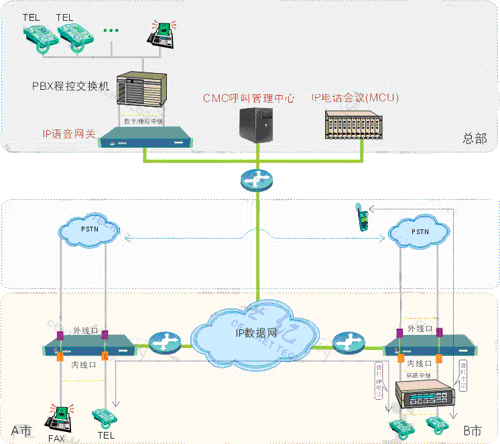 在各级办公机构的数据网节点上安装IP语音设备,并通过模拟/数字E1中继接口连接当地原有的办公电话环境(程控电话交换机、直线市话、电信虚拟网等)。实现机构内部办公电话通过IP数据网通信。同时机构以外的长途电话也可以利用IP电话网传输,通过被叫地市的IP语音网关接通当地PSTN市话网,从而不产生任何长途通信费用。