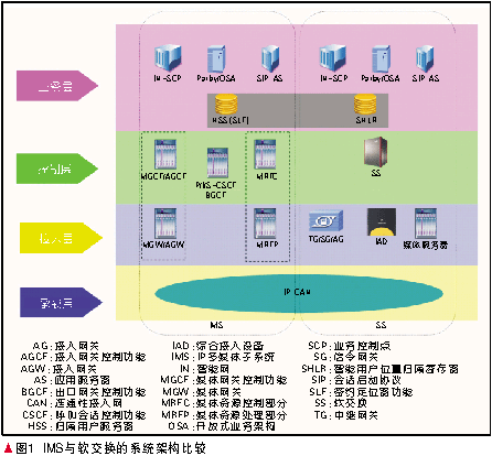 同样作为NGN核心控制功能实体的软交换(SS)和IMS,都可以提供具有实时性要求的业务的呼叫控制和连接控制功能,是下一代网络呼叫与控制的核心。在系统架构上,基于SS和基于IMS的NGN完全类似,都可以分为业务层、控制层、接入层和承载层4层。IMS与软交换系统架构的比较如图1所示。