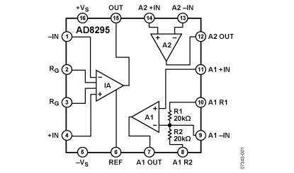 AD8295在4 mm × 4 mm小型封装内集成了精密仪表放大器前端所需的全部器件,其中包含一个高性能仪表放大器、两个通用运算放大器和两个精密匹配的10 kΩ电阻。