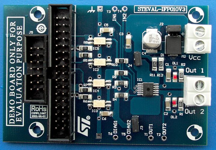 The STEVAL-IFP010V3 demonstration board is based on the VNI2140J, a monolithic device designed using ST’s VIPower technology for driving two independent resistive or inductive loads with one side connected to ground. Active current limitation prevents a drop in system power supply if the load is shorted. A built-in thermal shutdown protects the chip from overtemperature and short-circuit conditions. During an overload condition, the channel turns off and back on automatically in order to maintain the junction temperature between TTSD and TR. If this condition causes the case temperature to reach TCSD, the overloaded channel is turned off and will restart only when the case temperature has decreased down to TCR.