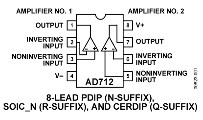 The AD712 is pinned out in a standard op amp configuration and is available in seven performance grades. The AD712J and AD712K are rated over the commercial temperature range of 0°C to +70°C. The AD712A, AD712B and AD712C are rated over the industrial temperature range of -40°C to +85°C. The AD712S and AD712T are rated over the military temperature range of -55°C to +125°C and are available processed to MIL-STD- 883B, Rev. C. Extended reliability PLUS screening is available, specified over the commercial and industrial temperature ranges. PLUS screening includes 168-hour burn-in, as well as other environmental and physical tests.