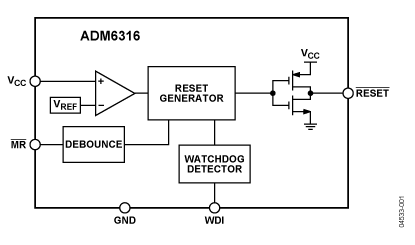 The ADM6316/ADM6317/ADM6318/ADM6319/ADM6320/ ADM6321/ADM6322 are supervisory circuits that monitor power supply voltage levels and code execution integrity in microprocessor-based systems. As well as providing power- on reset signals, an on-chip watchdog timer can reset the microprocessor if it fails to strobe within a preset timeout period. A reset signal can also be asserted by an external push button through a manual reset input. The seven parts feature different combinations of watchdog input, manual reset input, and output stage configuration, as shown in Table 1.