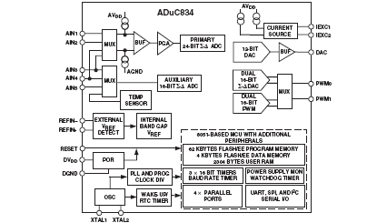 ADuC834 MicroConverter®是一款完全集成的单芯片24位数据采集系统。与ADI公司的所有MicroConverter产品一样,它在单芯片上提供精密模数和数模转换功能以及一个Flash微控制器。ADuC834(硬件和软件)完全向后兼容ADuC824。ADuC834提供52引脚PQFP或56引脚CSP封装,采用3V或5V电源供电。