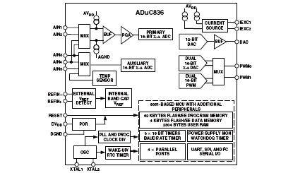 ADuC836 MicroConverter®是一款完全集成的单芯片16位数据采集系统。与ADI公司的所有MicroConverter产品一样,它在单芯片上提供精密模数和数模转换功能以及一个Flash微控制器。ADuC836(硬件和软件)完全向后兼容ADuC816。它提供52引脚PQFP或56引脚CSP封装,采用3V或5V电源供电。