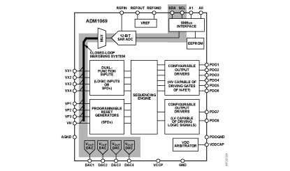 The ADM1069 Super Sequencer® is a configurable supervisory/ sequencing device that offers a single-chip solution for supply monitoring and sequencing in multiple supply systems. In addition to these functions, the ADM1069 integrates a 12-bit ADC and four 8-bit voltage output DACs. These circuits can be used to implement a closed-loop margining system that enables supply adjustment by altering either the feedback node or reference of a dc-to-dc converter using the DAC outputs.