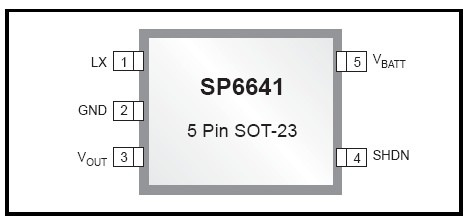The SP6641 is an ultra-low quiescent current, high efficiency, DC-DC boost converter designed for single and dual cell alkaline, or Li-ion battery applications found in PDA’s, MP3 players, and other handheld portable devices. The SP6641 features a 10μA quiescent current, a 0.3Ω Nchannel charging switch, 0.9V input startup, and a 0.33A or 1.0A inductor current limiting feature. The SP6641 is offered in a 5 pin SOT-23 package and provides an extremely small power supply footprint optimized for portable applications. The SP6641 is preset to 3.3V and can be controlled by a 1nA active LOW shutdown pin.