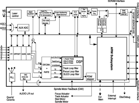 The STA1052 is a single chip device which performs all functions related to read back of optical disk: servo control operations, reading optical disc decoding the High frequency signals, EFM decoding, error correction, software decoding of MP3 and WMA encoded audio, sample rate conversion, managing file system, serial transfer of audio/program through I2S/SPDIF, direct playback of audio through in-built audio DAC.