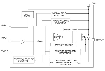 Active current limitation combined with thermal shutdown and automatic restart protects the device against overload. The device detects the open load condition in both the on and off state. In the off state the device detects if the output is shorted to VCC. The device automatically turns off in the case where the ground pin becomes disconnected.