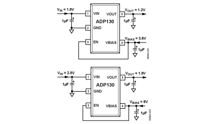 与单电源解决方案相比,双电源解决方案通常能够提高转换效率,这是因为其可以利用较高的VBIAS电源为器件供电,而利用较低的VIN电源为负载提供电流,器件的功耗因此得以降低。ADP130经过优化,仅需小型1 μF陶瓷电容即可稳定工作,它在极小的电路板面积内提供良好的瞬态性能。