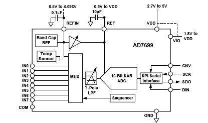 AD7699拥有多通道、低功耗、数据采集系统所需的所有要素,包括:无失码的真16-bit SAR ADC;用于将输入配置为单端输入(使用或不使用参考地)、差分输入或双极输入的、4通道、低串扰的多路复用器;内部低漂移基准源(可以选择2.5V或4.096V)和缓冲器;温度传感器