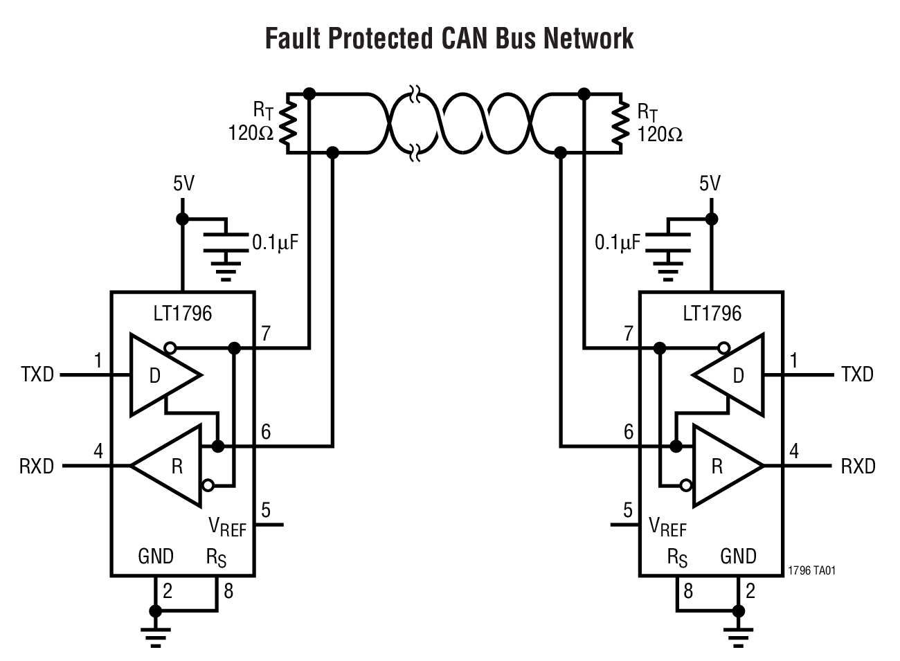 LT®1796 CAN 收发器具有内置容错能力,可安全耐受工业和汽车环境。不需要使用分立的保护器件。总线接口引脚能够承受高达 ±60V (相对于地电位) 的电压故障,而不会损坏器件。故障有可能在收发器处于运行、停机或断电状态时发生。片内 ESD 保护功能电路可承受高达 ±15kV 的空气放电和 ±8kV 的接触模式放电测试,完全符合 IEC-1000-4-2 规格要求。电源或接地连接的丢失并不会损坏 IC。