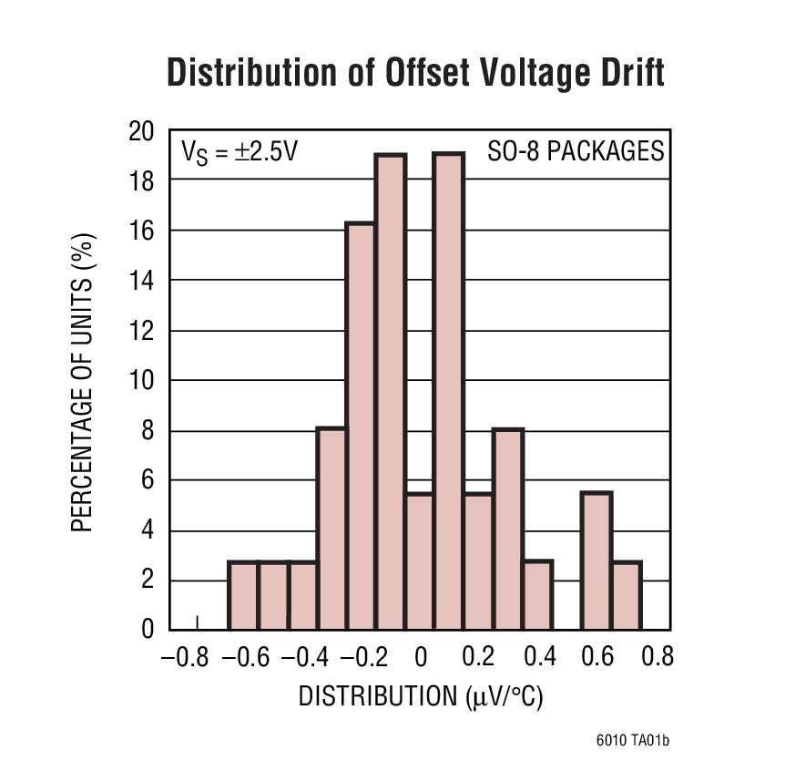 Input offset voltage is trimmed to less than 35µV. The low drift and excellent long-term stability guarantee a high accuracy over temperature and over time. The 110pA maximum input bias current and 120dB minimum voltage gain further maintain this precision over operating conditions.