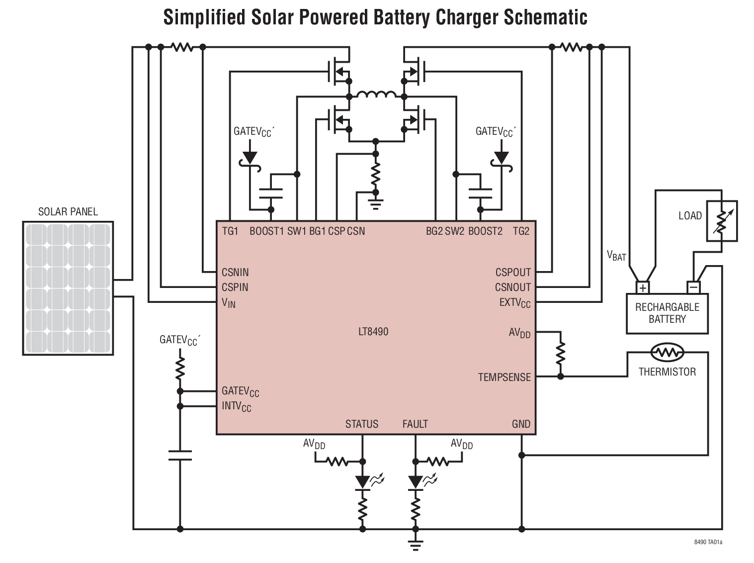 LT®8490 是一款降压-升压型开关稳压器电池充电器,其执行一种用于大多数电池类型的恒定电流恒定电压 (CCCV) 充电模式,包括密封型铅酸 (SLA) 电池、富液电池、凝胶电池和锂离子电池。该器件可采用高于、低于或等于输出电压的输入电压运作,并能由太阳能电池板或 DC 电源供电。片内逻辑电路提供了面向太阳能供电型应用的自动最大功率点跟踪 (MPPT) 功能。LT8490 可通过检测一个热耦合至电池的外部热敏电阻来完成自动温度补偿。包含充电器信息的 STATUS 和 FAULT 引脚可用于驱动 LED 指示灯。该器件采用扁平 (0.75mm) 7mm x 11mm 64 引线 QFN 封装。