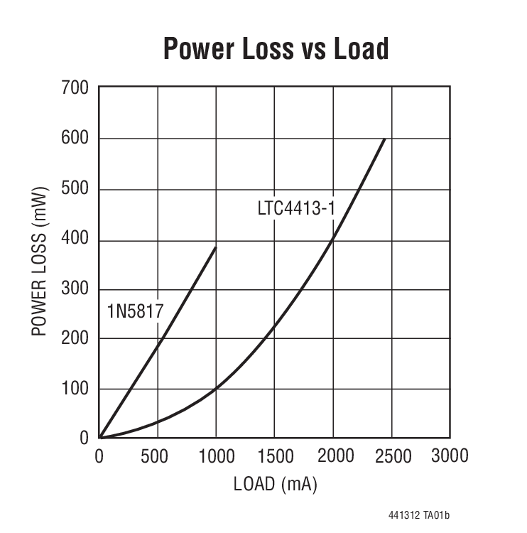 The LTC4413-1 and LTC4413-2 each contain two monolithic ideal diodes, each capable of supplying up to 2.6A from input voltages between 2.5V and 5.5V. The ideal diodes use a 100mΩ P-channel MOSFET to independently connect INA to OUTA and INB to OUTB. During normal forward operation, the voltage drops across each of these diodes are regulated to as low as 18mV. Quiescent current is less than 80µA for diode currents up to 1A. If either of the output voltages exceeds its respective input voltage, that MOSFET is turned off and less than 1µA of reverse current fl ows from OUT to IN. Maximum forward current in each MOSFET is limited to a constant 2.6A and internal thermal limiting circuits protect the part during fault conditions. An internal overvoltage protection sensor detects when a voltage exceeds the LTC4413-2 absolute maximum voltage tolerance.