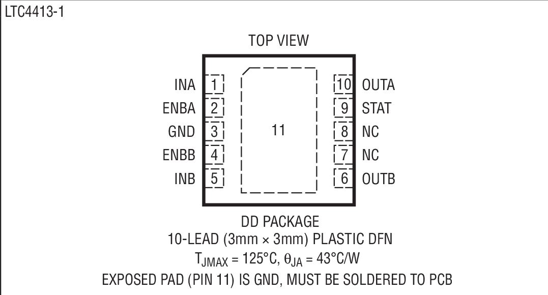 The LTC4413-1/LTC4413-2 are housed in a 10-lead 3mm × 3mm DFN package.