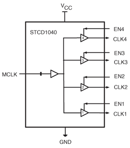 The STCD1020, STCD1030 and STCD1040 are 2, 3 or 4 outputs unity gain clock distribution circuits, which are used to provide a common frequency clock to multimode mobile RF applications. It can also be used for those baseband peripheral applications in a mobile phone such as WLAN, Bluetooth, GPS and DVB-H as a clock reference. The STCD1020, STCD1030 and STCD1040 isolate each device driven by their clock outputs and minimize interference between the devices. Each of the clock buffers can be disabled to lower the power consumption if the connected device does not need the clock. The STCD1020, STCD1030 and STCD1040 accept commonly used mobile master clock frequencies ranging from 10 MHz to 52 MHz.