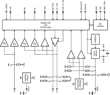 The transceiver is capable of operation in several different modes. It can operate in basic USB-OTG mode, as an UART transceiver or in audio mode. Behavior of the transceiver is fully configurable through the two-wire I²C serial bus. The transceiver supports session request protocol and host negotiation protocol