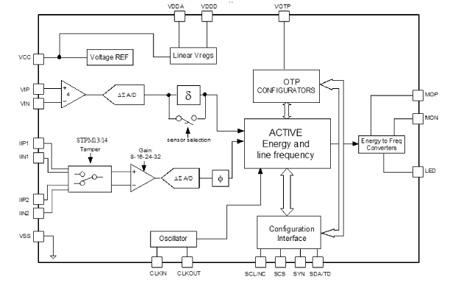 The STPM1x family is designed for effective measurement of active energy in a power line system using a Rogowski Coil, current transformer and shunt sensors. This device is specifically designed to provide all the necessary features to implement a single phase energy meter without any other active component. The STPM1x device family consists, essentially, of two parts: the analog part and the digital part. The former, is composed of a preamplifier and first order ∑ Δ A/D converter blocks, band gap voltage reference, low drop voltage regulator. The digital part is composed of a system control, oscillator, hard wired DSP and interface for calibration and configuration. The calibration and configuration are done by OTP cells, that can be programmed through a serial interface. The configured bits are used for testing, configuration and calibration purposes. From two ∑ Δ output signals coming from the analog section, a DSP unit computes the amount of consumed active energy. The active energy is available as a pulse frequency output and directly driven by a stepper counter. In the STPM1x an output signal with pulse frequency proportional to energy is generated. This signal is used in the calibration phase of the energy meter application allowing a very easy approach. When the device is fully configured and calibrated, a dedicated bit of OTP block can be written permanently in order to prevent accidental entry into test mode or changing any configuration bit.