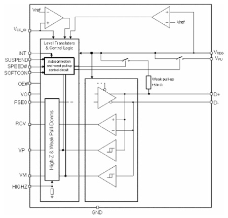 It supports both full-speed (12 Mbps) and lowspeed (1.5 Mbps) operation. It is also designed to operate down to 1.6 V so that it is compatible with lower system voltages of most portable systems, which include cell phones, PDAs and MP3 players