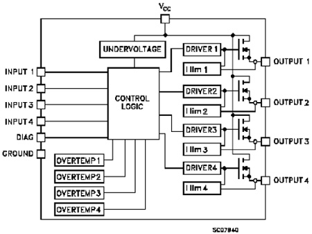The VN330SP-E is a monolithic device made using STMicroelectronics VIPower technology, intended for driving four indipendent resistive or inductive loads, with one side connected to ground. Active current limitation avoids dropping the system power supply in case of shorted load. Built-in thermal shut-down protects the chip from overtemperature and short circuit. The open drain diagnostic output indicates overtemperature conditions.